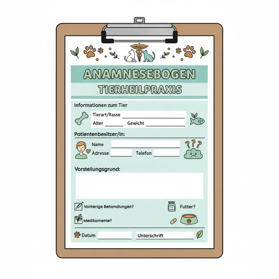 In vielen Fällen hilft der Anamnesebogen bereits im Vorfeld des Termins, die Symptome und Besonderheiten Ihres Tieres ausführlich zusammenzufassen, damit später nichts Wichtiges vergessen wird.